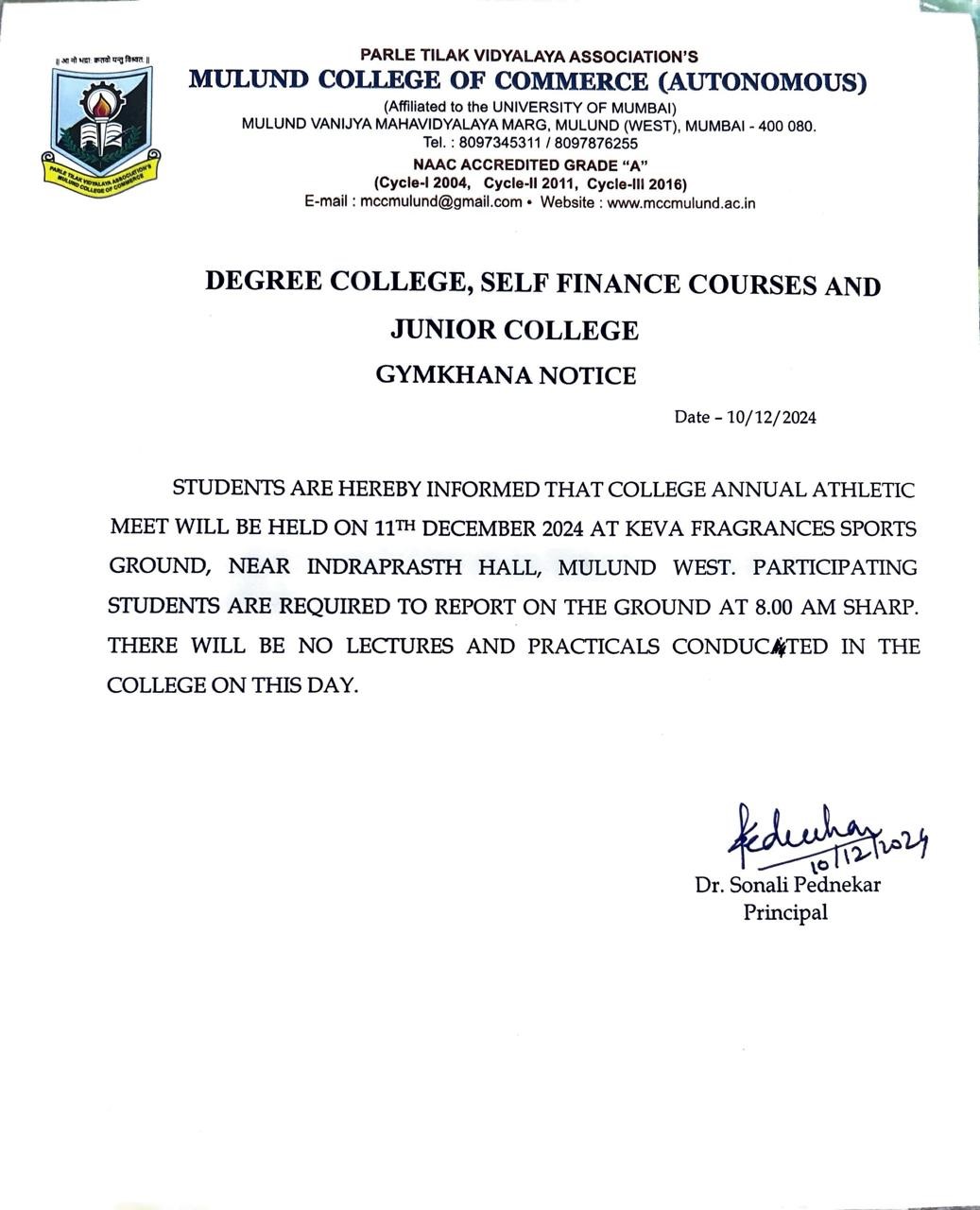 Parle Tilak Vidyalaya Association’s Mulund College of Commerce (Autonomous), has a rich legacy of inculcating quality education through right values. The philosophy of PTVA is ‘to educate, empower and elevate the students to equip them with the right knowledge, right understanding, right values and right skills in a secure and conducive learning environment.’ At MCC, every effort is made to imbibe the PTVA philosophy in the right spirit. MCC is known for its discipline, quality education and overall development of studentsRead more...